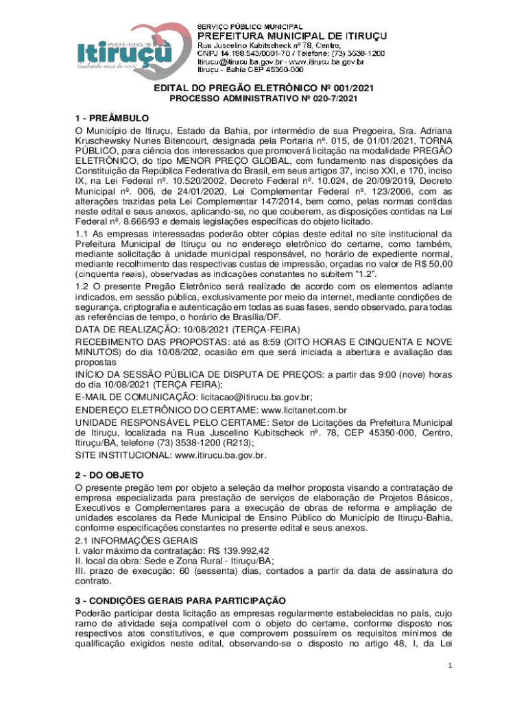 EDITAL DO PREGO ELETRNICO N 001/2021 PROCESSO ADMINISTRATIVO N 0207/20211 PREMBULO O Municpio de Itiruu, Estado da Bahia, por intermdio de sua Pregoeira, Sra. Adriana Kruschewsky Nunes Bitencourt,