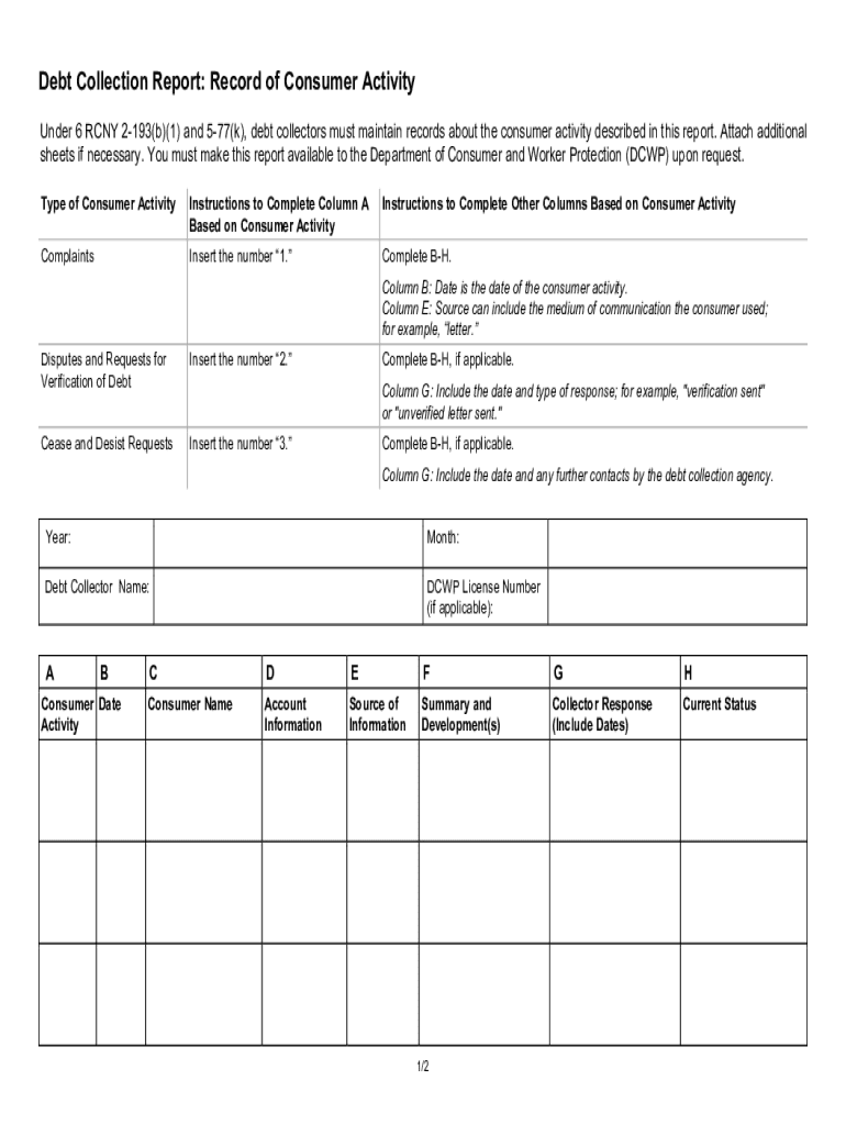 A required report for debt collectors to maintain records of consumer activity, including complaints, disputes, and requests for verification of debt, to be made available to the Department of Consumer and Worker Protection upon request.