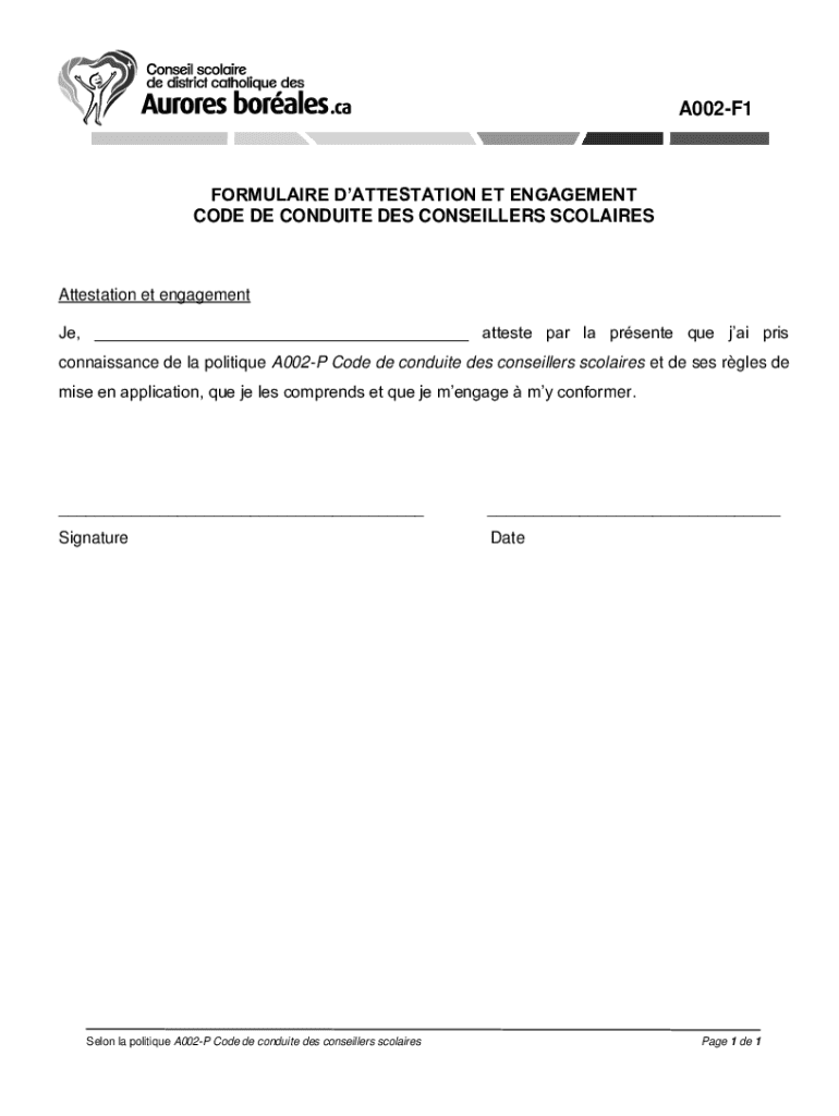 A002F1FORMULAIRE DATTESTATION ET ENGAGEMENT CODE DE CONDUITE DES CONSEILLERS SCOLAIRESAttestation et engagement Je, ___ atteste par la prsente que jai pris connaissance de la politique A002P Code