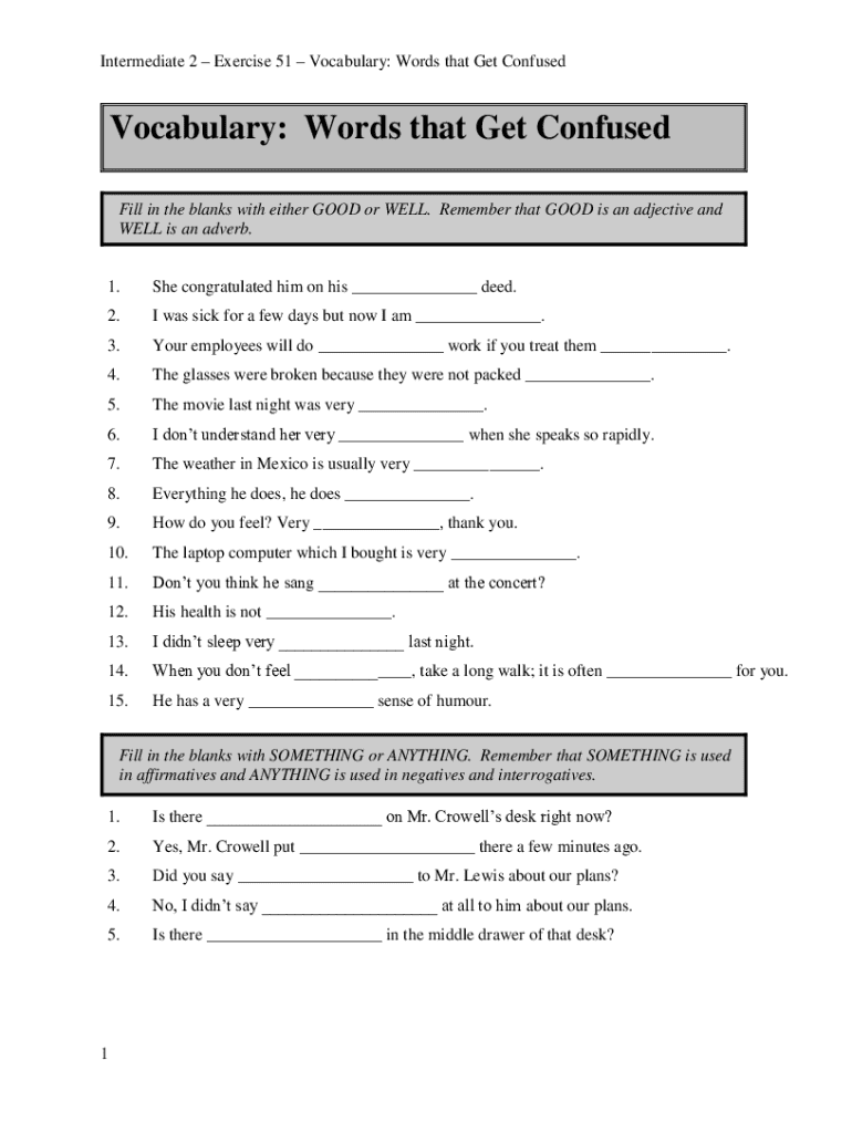 Intermediate 2 Exercise 51 Vocabulary: Words that Get ConfusedVocabulary: Words that Get Confused Fill in the blanks with either GOOD or WELL. Remember that GOOD is an adjective and WELL is an adverb.