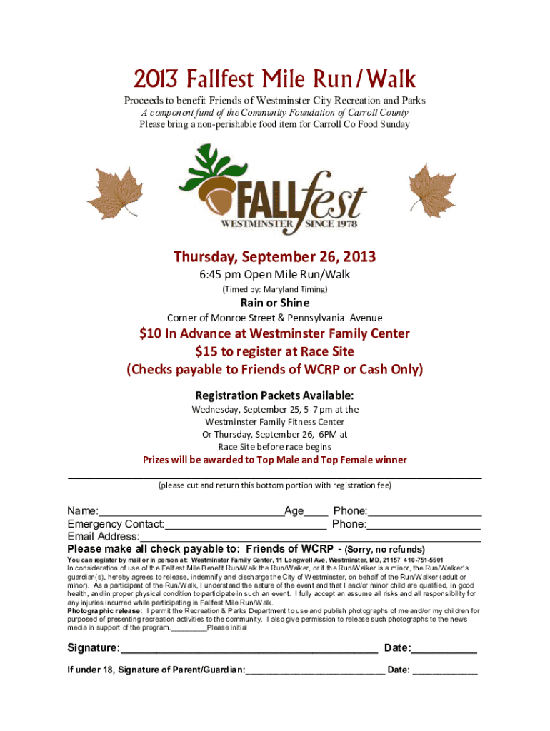 This document provides details about the 2013 Fallfest Mile Run/Walk event organized to benefit the Friends of Westminster City Recreation and Parks. It includes registration information, event schedule, participation requirements, and disclaimers. Participants are encouraged to bring non-perishable food items.