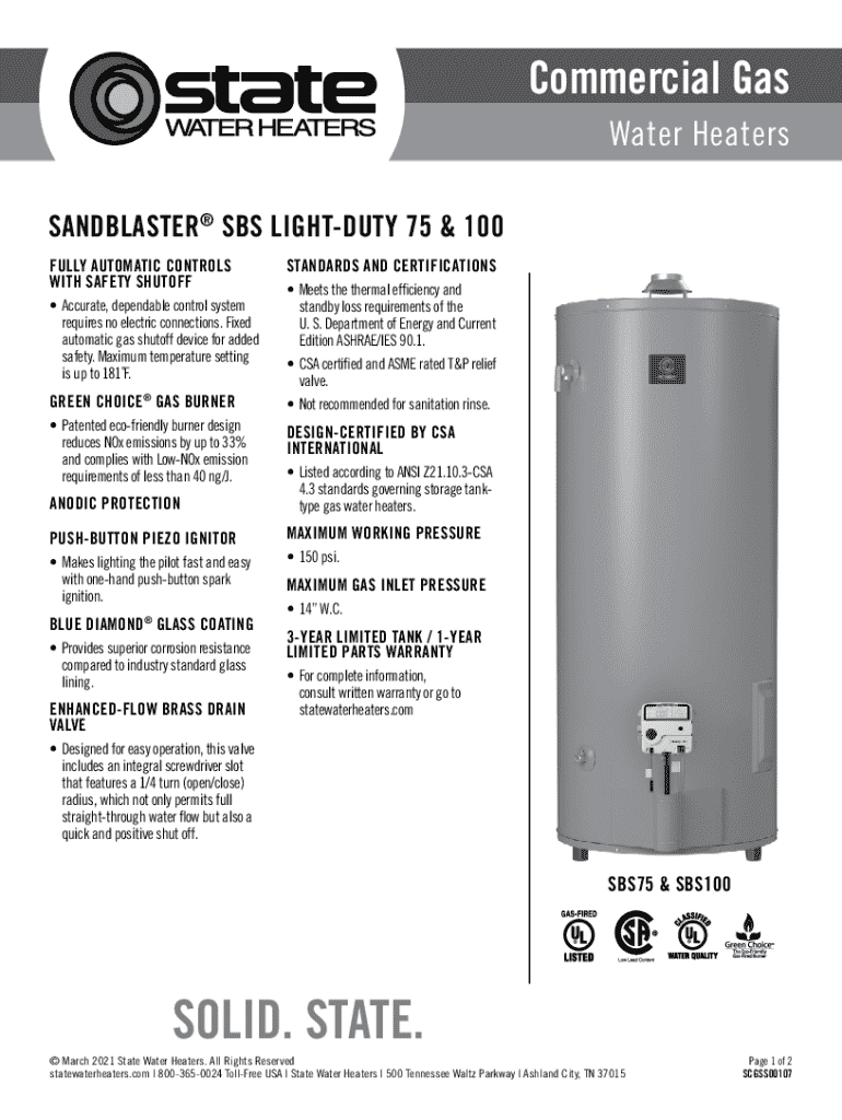 This document provides specifications and features for the SANDBLASTER® SBS LIGHT-DUTY gas water heaters, including information on controls, safety features, efficiency standards, and design certifications.