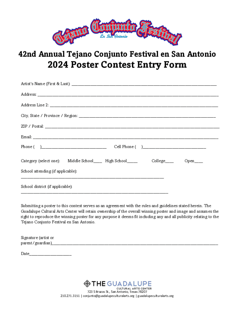 This document is an entry form for the poster contest associated with the 42nd Annual Tejano Conjunto Festival in San Antonio. It requires artist details, school information, and agreement to the contest rules, with ownership rights assigned to the Guadalupe Cultural Arts Center for the winning poster.