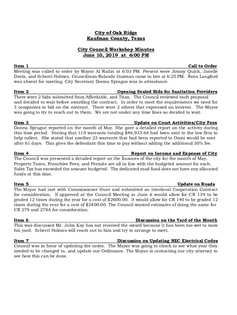 City of Oak Ridge Kaufman County, Texas City Council Workshop Minutes June 10, 2019 at 6:00 PM Item 1 Call to Order Meeting was called to order by Mayor Al Rudin at 6:03 PM. Present were Jimmy Quick,
