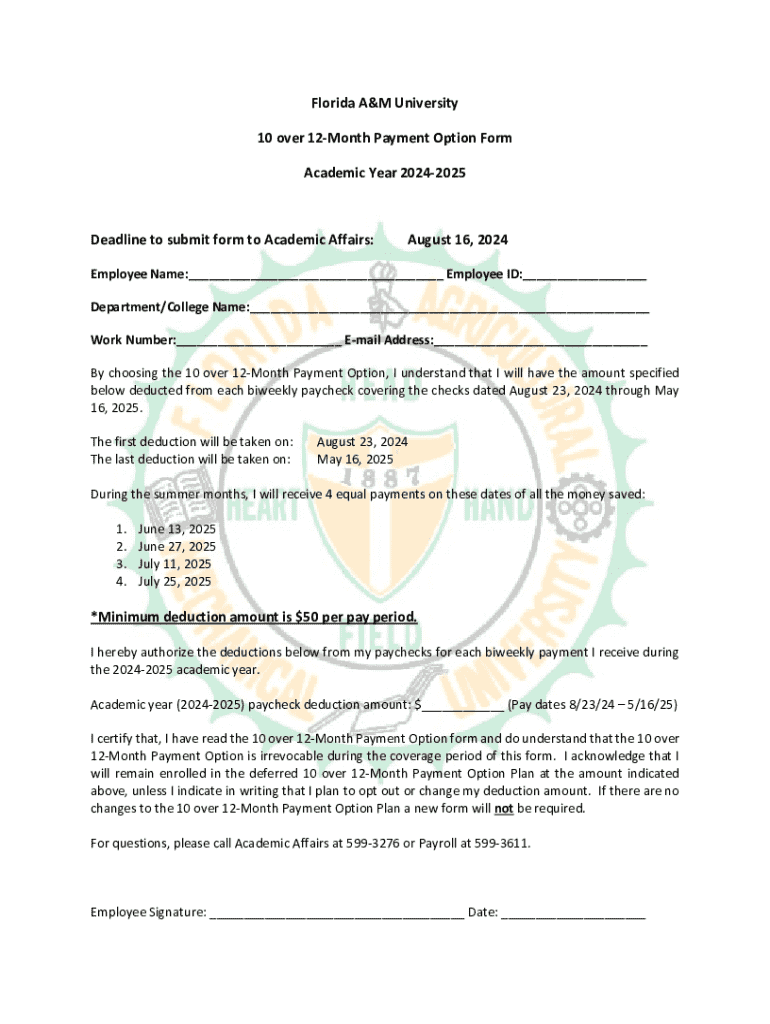 This form allows employees of Florida A&M University to opt for a 10 over 12-month payment plan for their salary deductions during the 2024-2025 academic year, detailing the payment schedule and authorizations required for participation.