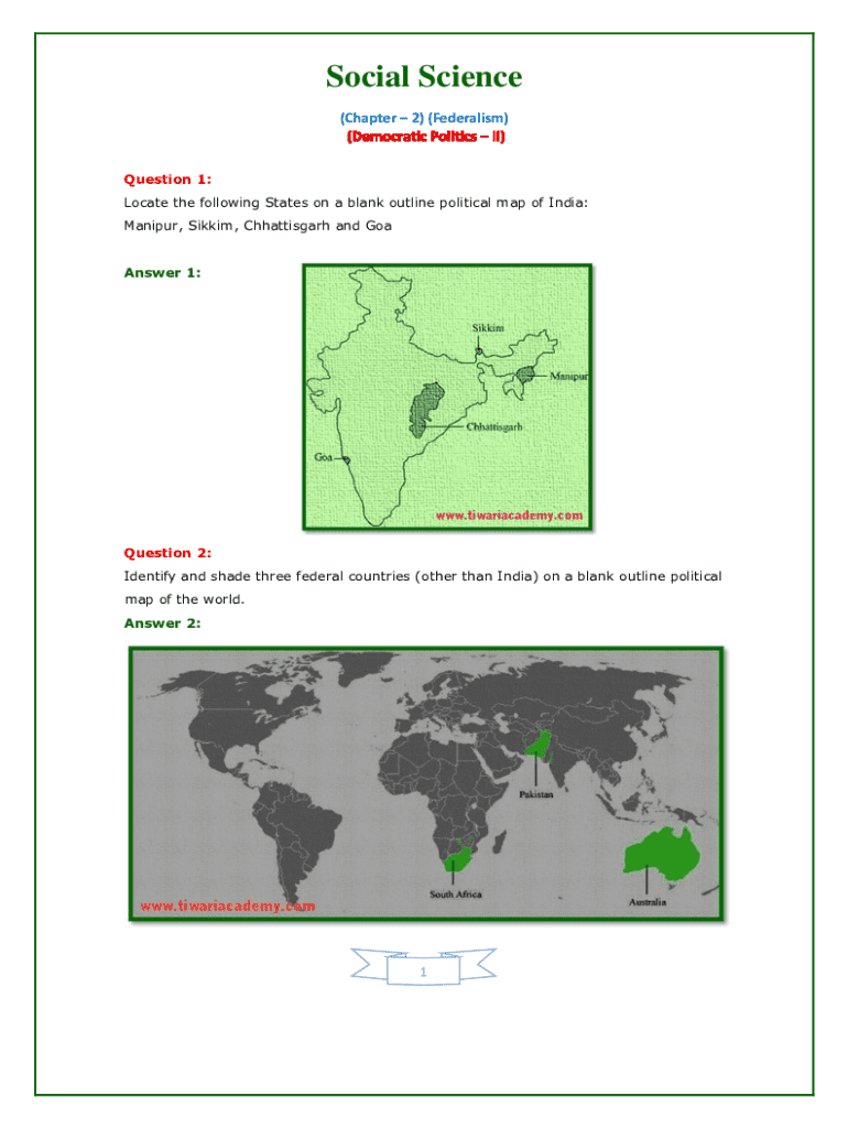 Social Science (Chapter 2) (Federalism)Question 1: Locate the following States on a blank outline political map of India: Manipur, Sikkim, Chhattisgarh and Goa Answer 1:Question 2: Identify and shade