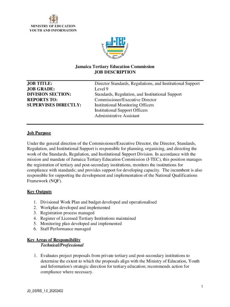 Jamaica Tertiary Education Commission JOB DESCRIPTION JOB TITLE: JOB GRADE: DIVISION SECTION: REPORTS TO: SUPERVISES DIRECTLY:Director Standards, Regulations, and Institutional Support Level 9 Standards,