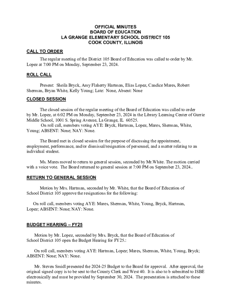 OFFICIAL MINUTES BOARD OF EDUCATION LA GRANGE ELEMENTARY SCHOOL DISTRICT 105 COOK COUNTY, ILLINOIS CALL TO ORDER The regular meeting of the District 105 Board of Education was called to order by Mr.