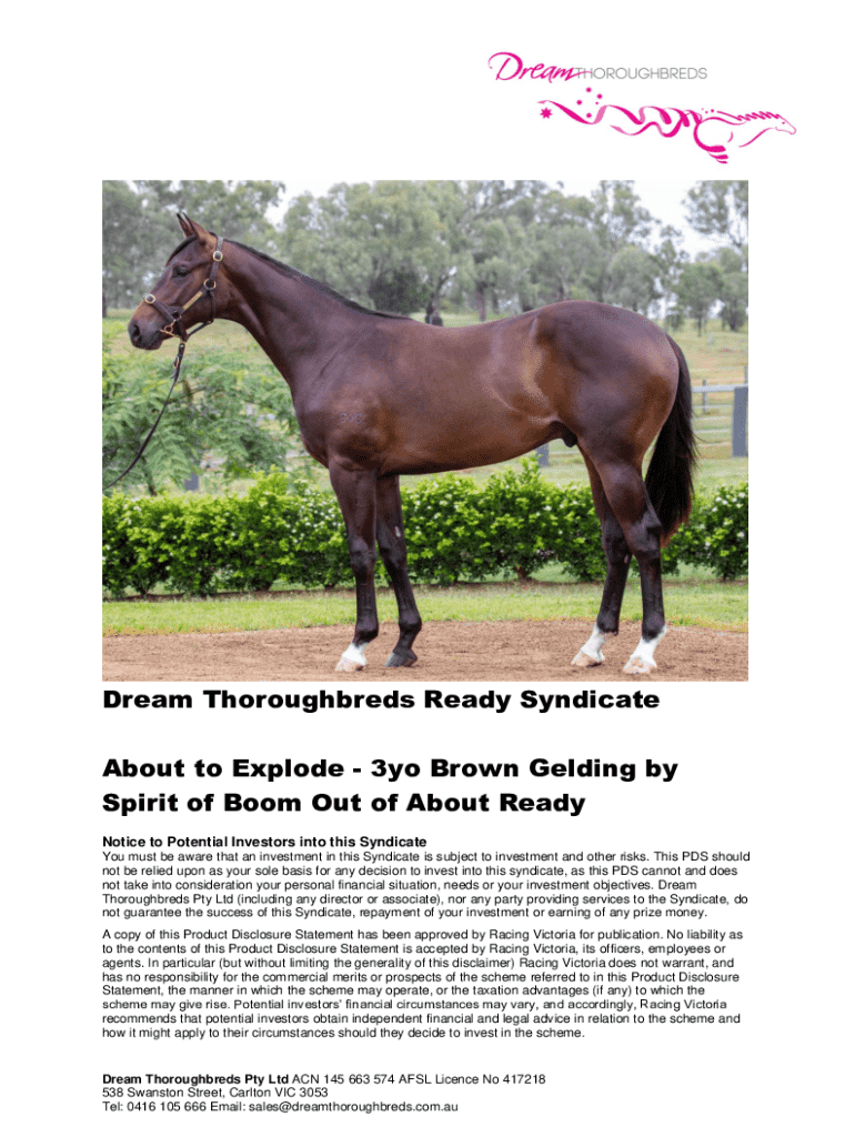 Dream Thoroughbreds Ready Syndicate About to Explode 3yo Brown Gelding by Spirit of Boom Out of About Ready Notice to Potential Investors into this Syndicate You must be aware that an investment in