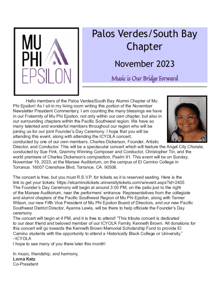 This newsletter from the Palos Verdes/South Bay Alumni Chapter of Mu Phi Epsilon highlights upcoming events, including the Founder’s Day Ceremony and the ICYOLA concert, focusing on the community’s connection to music and the celebration of talents. It also emphasizes the importance of supporting young performers and includes details about the Young Performers Showcase event.