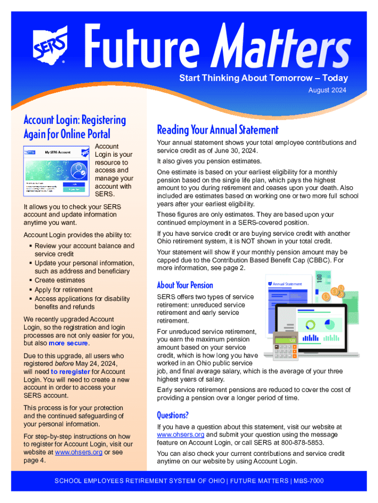 This document provides important updates regarding the School Employees Retirement System of Ohio, including information on account login registration, annual statements, pension information, preparing for retirement, and recent issues related to data breaches. It also includes a guide for registering for the online portal and highlights upcoming elections for board seats.