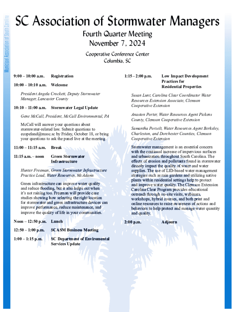 Municipal Association of South CarolinaSC Association of Stormwater Managers Fourth Quarter Meeting November 7, 2024 Cooperative Conference Center Columbia, SC 9:00 10:00 a.m.Registration10:00 10:10