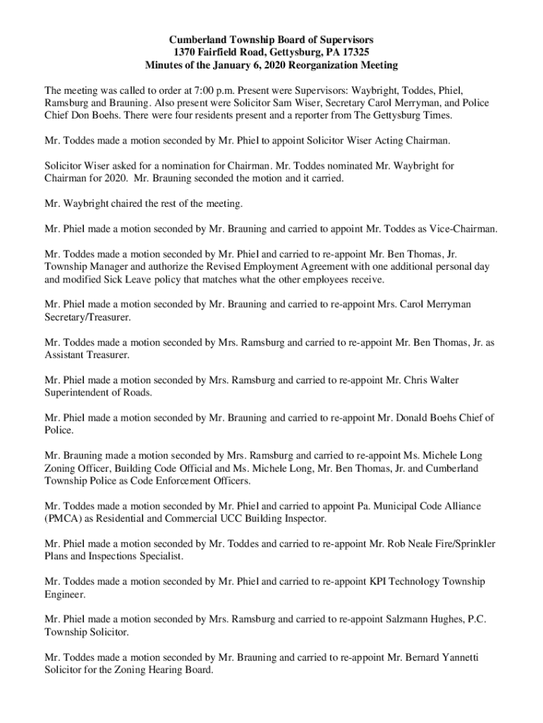 Get the free Cumberland Township Board of Supervisors Meeting Minutes