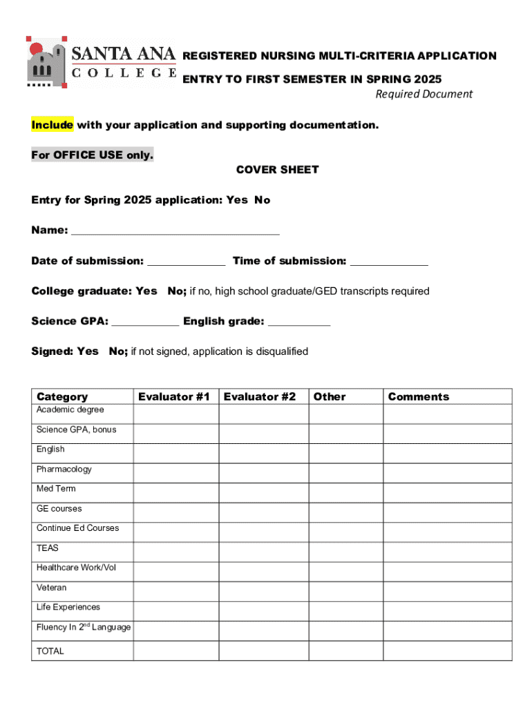 REGISTERED NURSING MULTICRITERIA APPLICATION ENTRY TO FIRST SEMESTER IN SPRING 2025Required DocumentInclude with your application and supporting documentation. For OFFICE USE only. COVER SHEET Entry