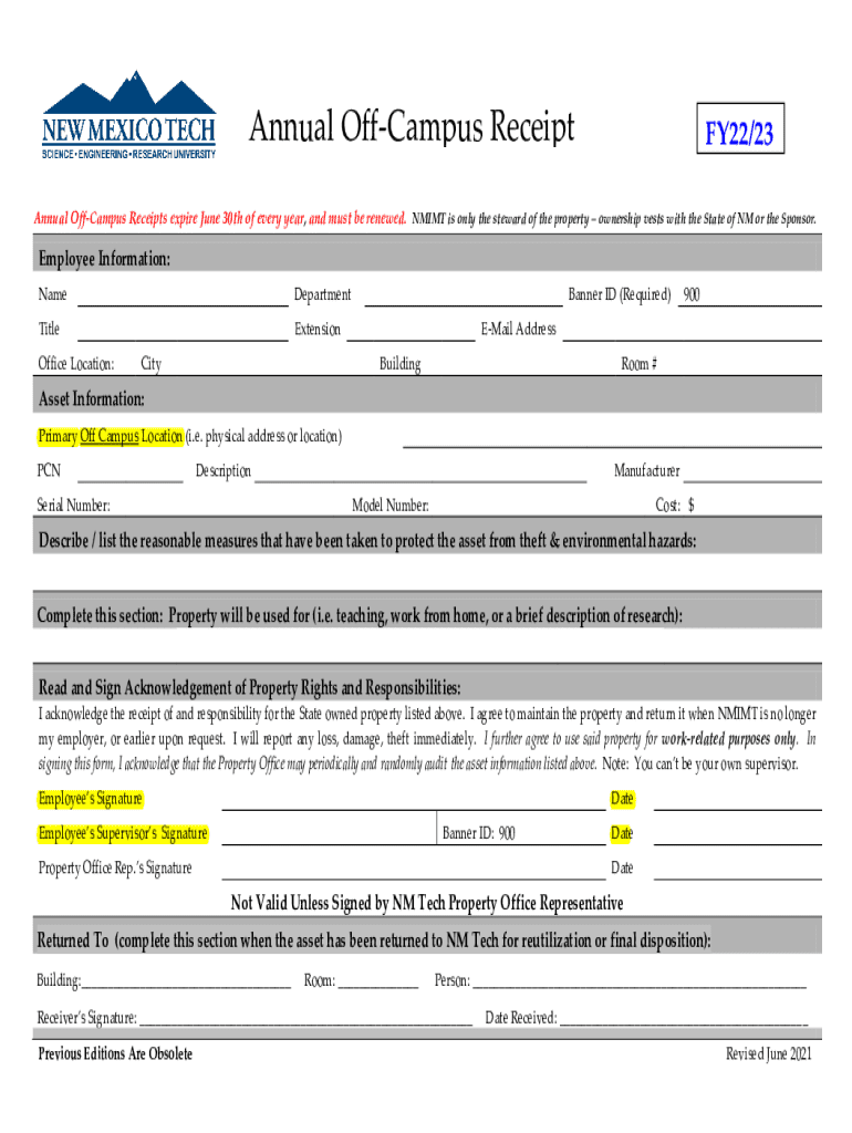 This document serves as an official receipt for off-campus property assigned to employees of NMIMT, detailing employee and asset information, responsibilities for care and reporting, and acknowledgment of property rights. It emphasizes the need for annual renewal and provides a framework for asset management while employed.