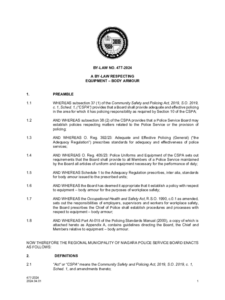 This by-law establishes policies regarding the provision, use, and function of body armour equipment for the Niagara Regional Police Service, ensuring workplace safety and compliance with relevant regulations and standards.
