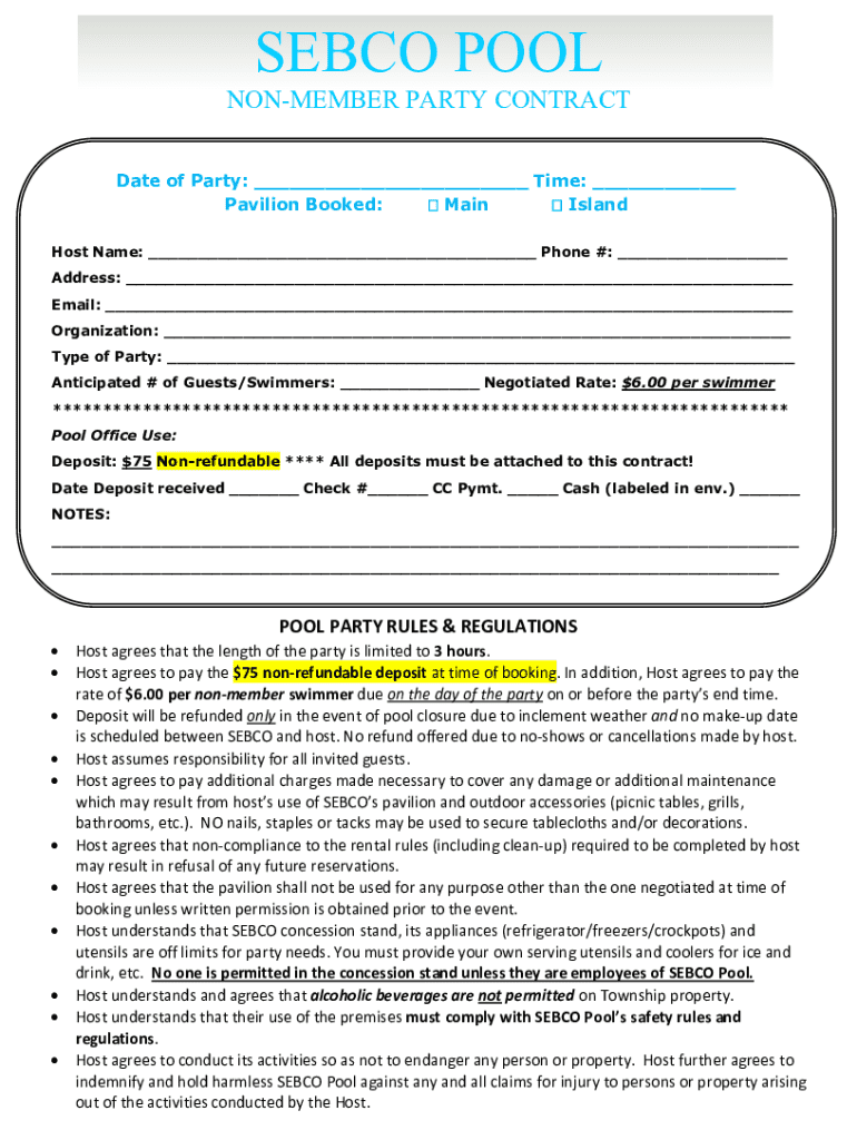 This contract outlines the terms and conditions for hosting a non-member party at SEBCO Pool, including payment details, rules and regulations, and responsibilities of the host.