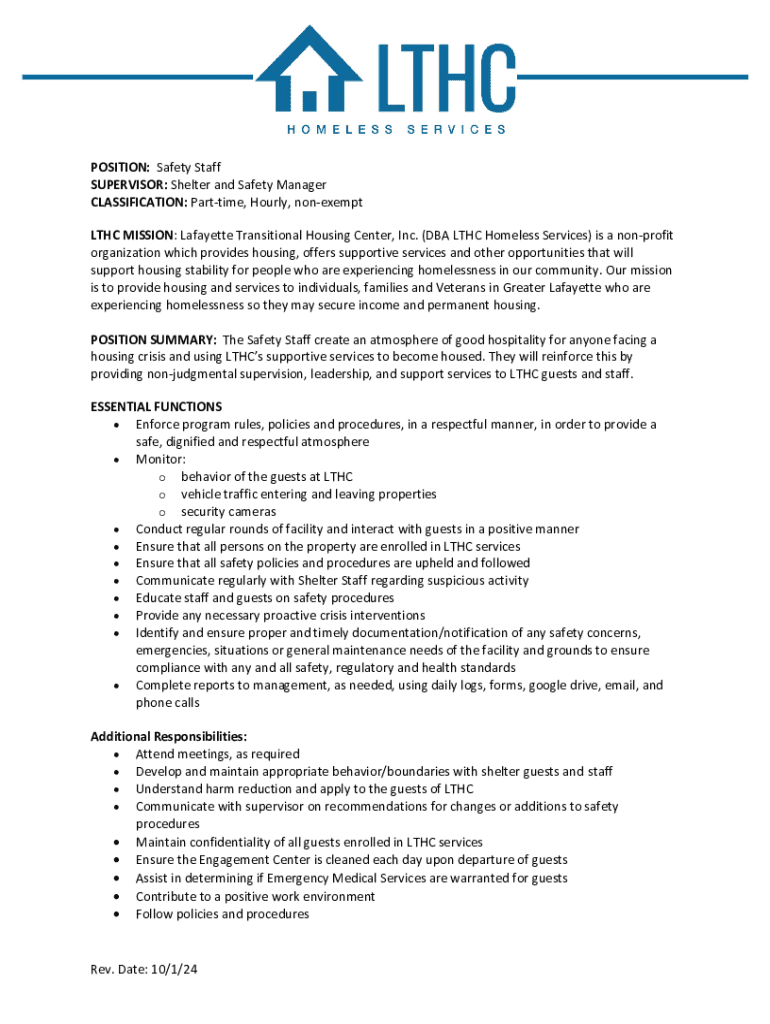 POSITION: Safety Staff SUPERVISOR: Shelter and Safety Manager CLASSIFICATION: Parttime, Hourly, nonexempt LTHC MISSION: Lafayette Transitional Housing Center, Inc. (DBA LTHC Homeless Services) is