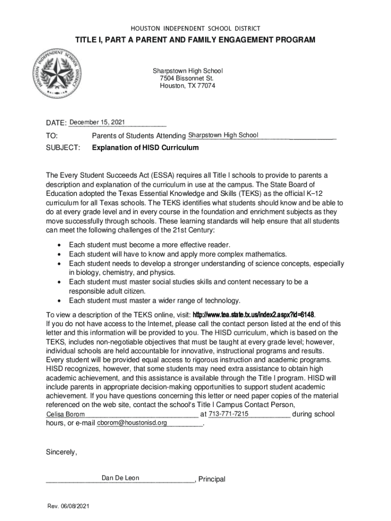This document provides an explanation of the curriculum implemented at Sharpstown High School under the Title I program, outlining the Texas Essential Knowledge and Skills (TEKS) that guide educational standards and expectations for student achievement.