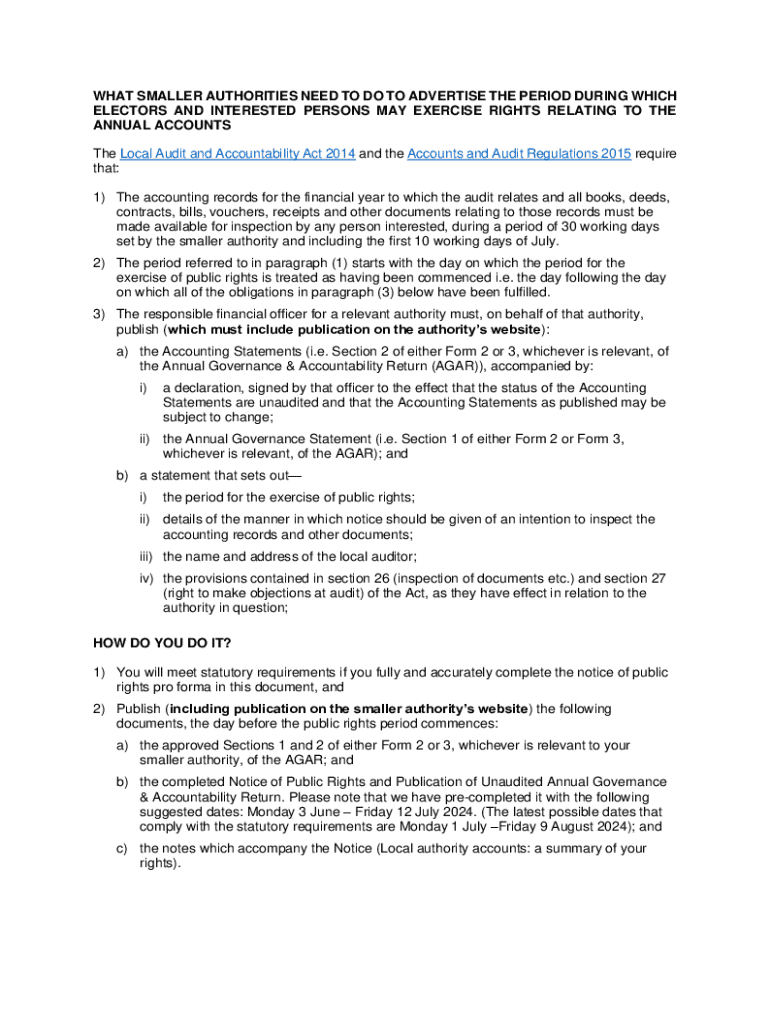 This document outlines the requirements for smaller authorities regarding the advertisement of the period during which electors and interested persons may exercise their rights relating to the annual accounts, as mandated by the Local Audit and Accountability Act 2014 and the Accounts and Audit Regulations 2015. It includes details on the inspection of accounting records, rights to question auditors, and procedures for raising objections at audit.