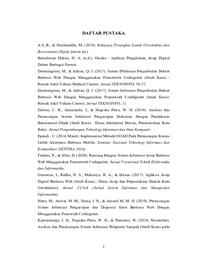 DAFTAR PUSTAKA A.S, R., & Shalahuddin, M. (2019). Rekayasa Perangkat Lunak (Terstruktur dan Berorientsai Objek) (revisi ed.). Burachman Hakim, H. A. (n.d.). Omeka : Aplikasi Pengelolaan Arsip Digital