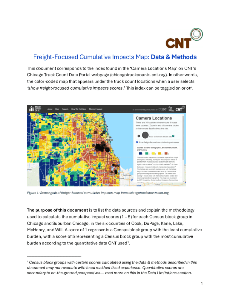 This document outlines the data sources and methodology used to calculate cumulative impact scores for Census block groups in Chicago and Suburban Chicago, focusing on freight-related variables. It provides insights into environmental exposures, demographics, health indicators, and freight logistics affecting these areas.