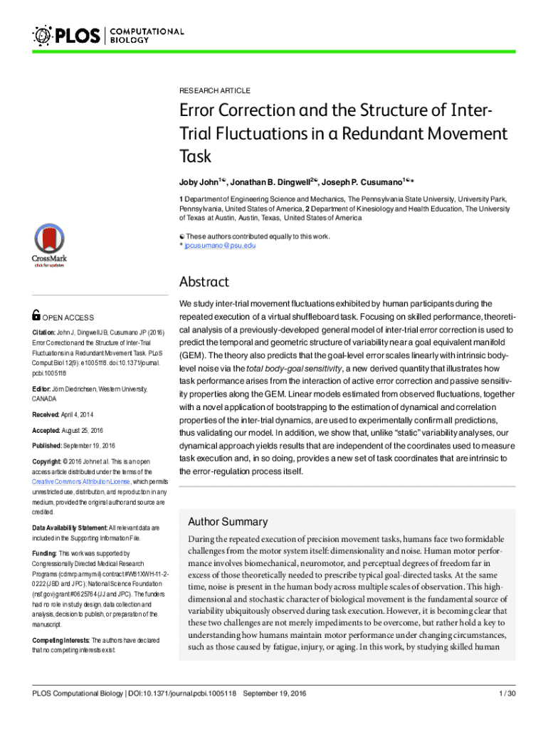 RESEARCH ARTICLEError Correction and the Structure of InterTrial Fluctuations in a Redundant Movement Task Joby John1, Jonathan B. Dingwell2, Joseph P. Cusumano1* 1 Department of Engineering Science