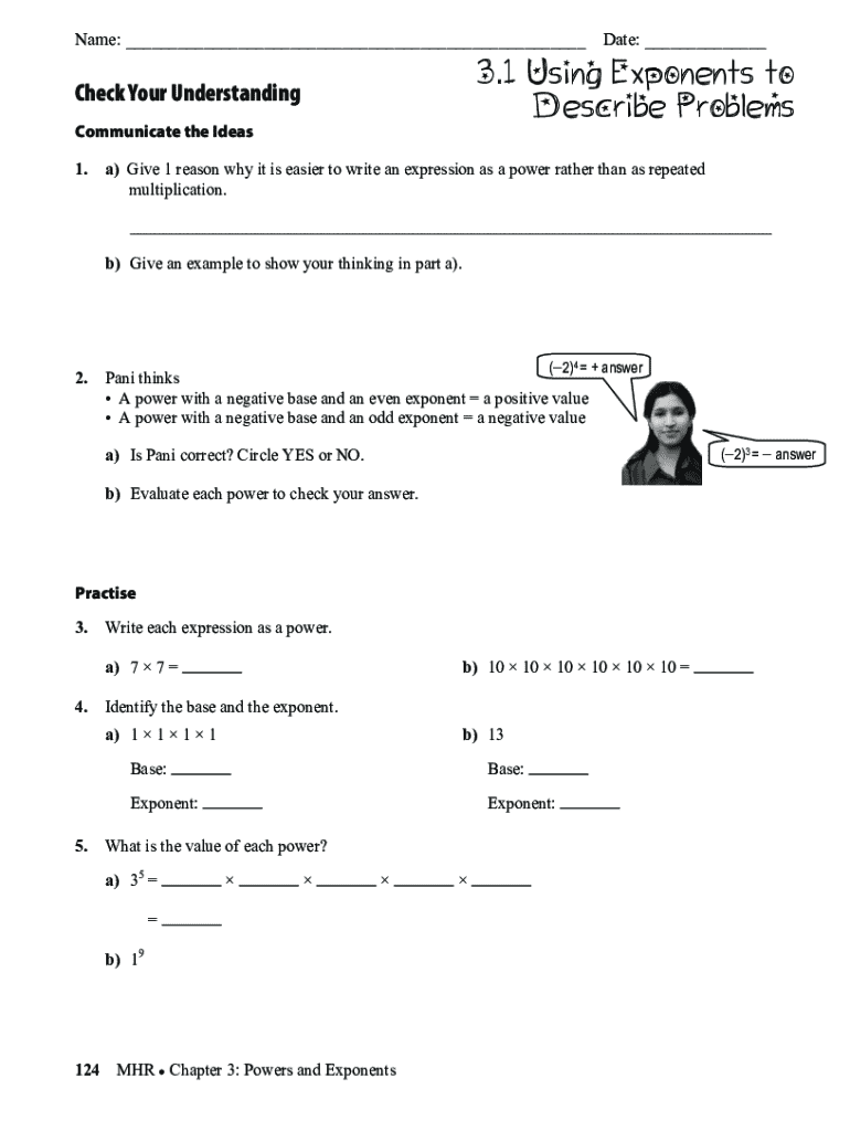 With pdfFiller, you may easily complete and sign 31 using exponents to online. It lets you modify original PDF material, highlight, blackout, erase, and write text anywhere on a page, legally eSign your document, and do a lot more. Create a free account to handle professional papers online.