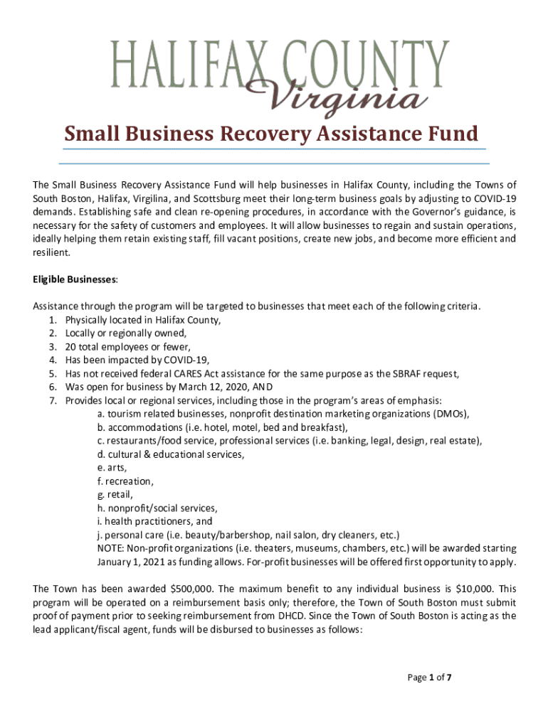 Small Business Recovery Assistance Fund The Small Business Recovery Assistance Fund will help businesses in Halifax County, including the Towns of South Boston, Halifax, Virgilina, and Scottsburg
