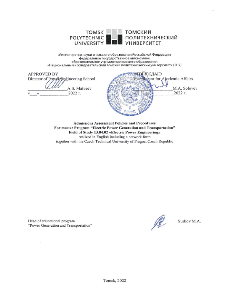 APPROVED BY Director of Power Engineering School Vice Rector for Academic Affairs___.S. Matveev ___ ___2022 .___.. Solovev ___ ___2022 .Admissions Assessment Policies and Procedures For master Program