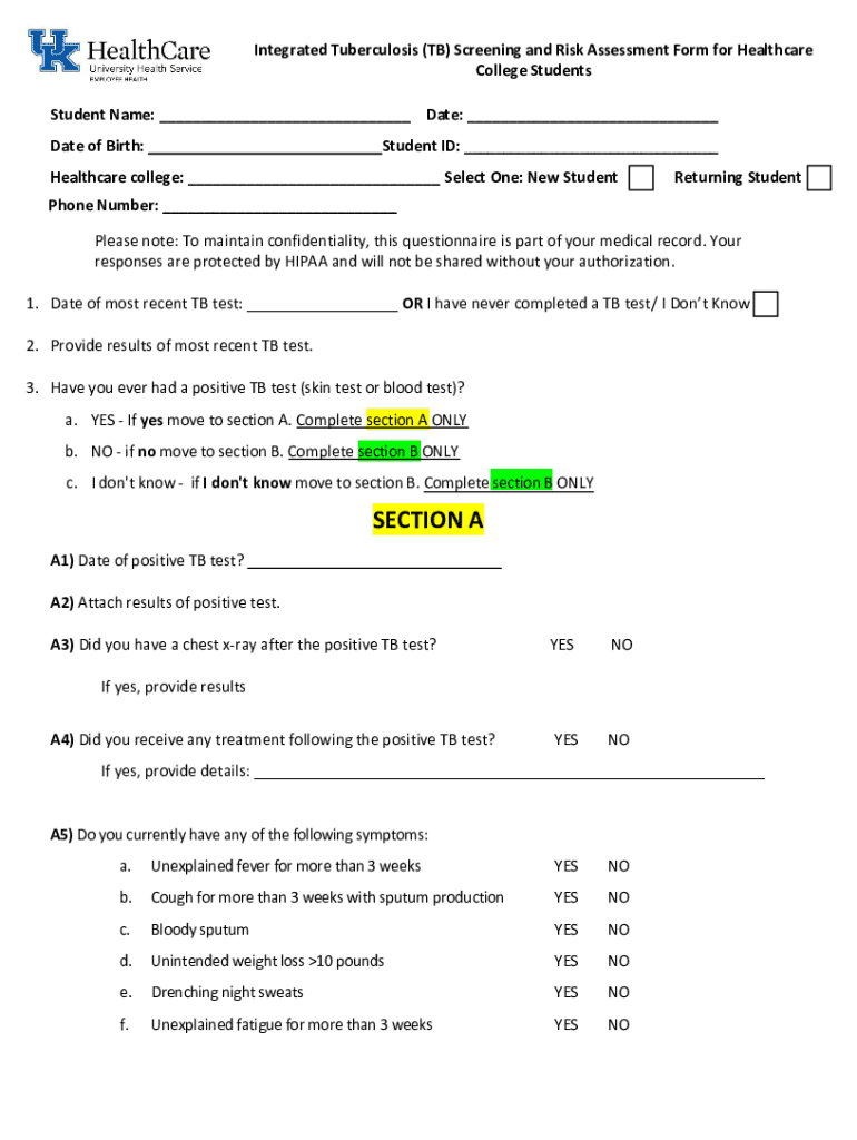 This form is designed for healthcare college students to assess their tuberculosis (TB) risk and screening results. It includes questions on past TB tests, symptoms, and potential risk factors related to TB exposure and infection.