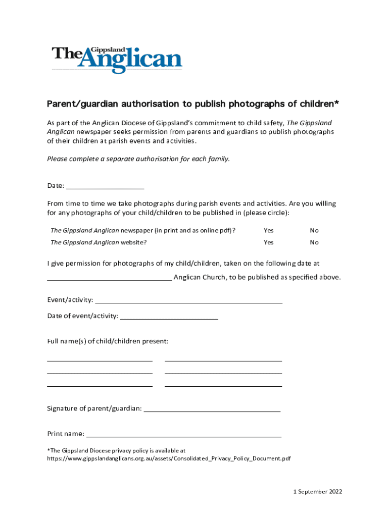 Parent/guardian authorisation to publish photographs of children* As part of the Anglican Diocese of Gippslands commitment to child safety, The Gippsland Anglican newspaper seeks permission from parents