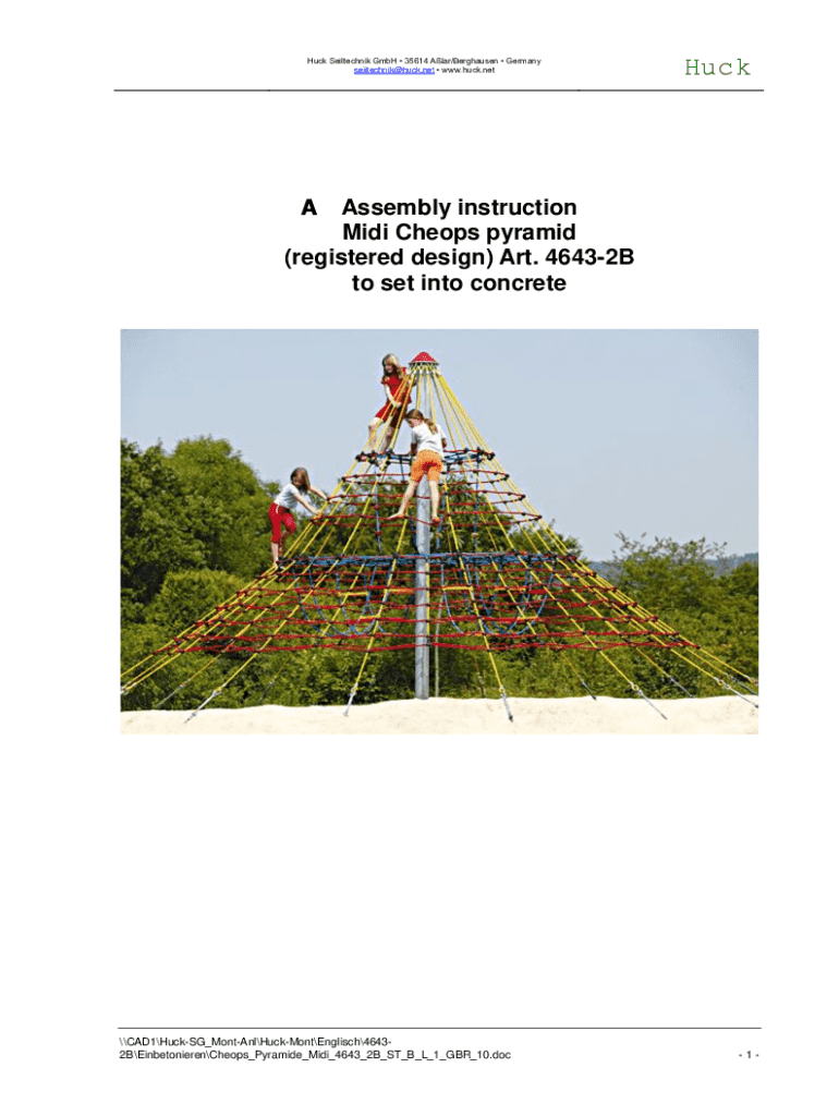 Huck Seiltechnik GmbH 35614 Alar/Berghausen Germany seiltechnik@huck.net www.huck.netHuckAAssembly instruction Midi Cheops pyramid (registered design) Art. 46432B to set into concreteCAD1HuckSG_MontAnlHuckMontEnglisch46432BEinbetonierenCheops_Pyramide_Midi_4643_2B_ST_B_L_1_GBR_10.doc1HuckHuck