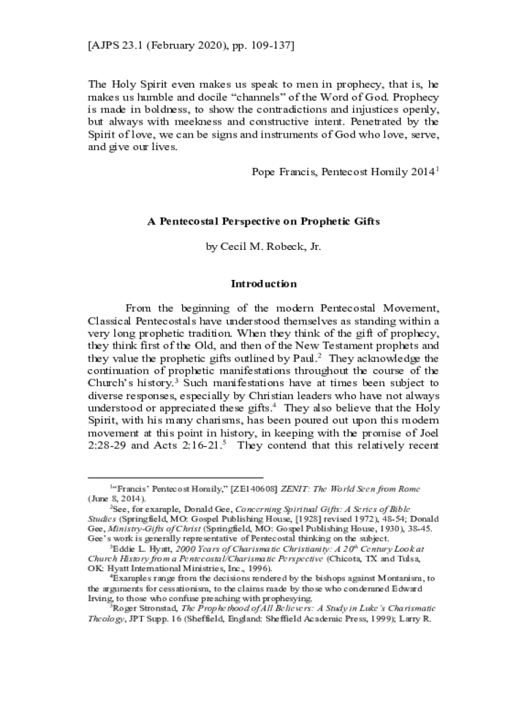 [AJPS 23.1 (February 2020), pp. 109137] The Holy Spirit even makes us speak to men in prophecy, that is, he makes us humble and docile channels of the Word of God. Prophecy is made in boldness, to