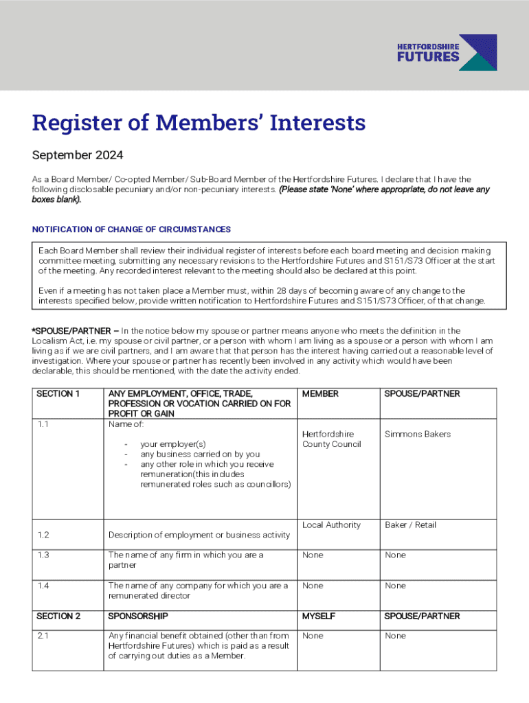 Register of Members Interests September 2024 As a Board Member/ Coopted Member/ SubBoard Member of the Hertfordshire Futures. I declare that I have the following disclosable pecuniary and/or nonpecuniary
