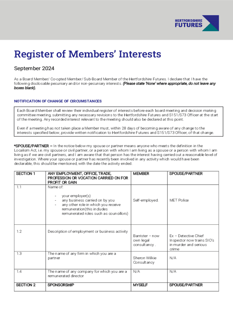 Register of Members Interests September 2024 As a Board Member/ Coopted Member/ SubBoard Member of the Hertfordshire Futures. I declare that I have the following disclosable pecuniary and/or nonpecuniary