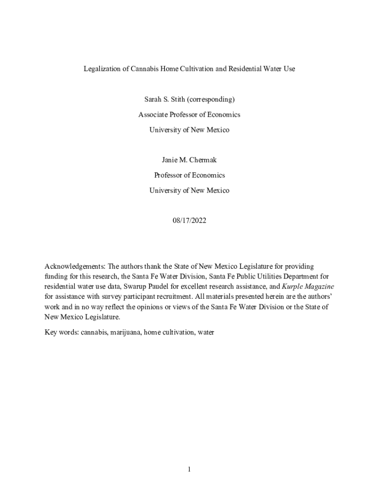This document analyzes the impact of the legalization of cannabis home cultivation in New Mexico, specifically focusing on its effects on residential water use. It presents empirical data from the Santa Fe Water Division and a pilot survey to explore changes in water consumption patterns, preferences for growing methods, and suggests policy recommendations for sustainable water use among cannabis growers.