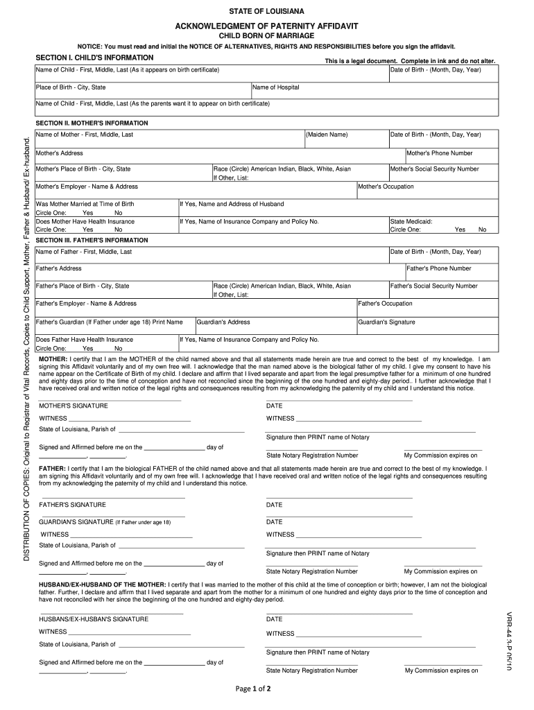 STATE OF LOUISIANA ACKNOWLEDGMENT OF PATERNITY AFFIDAVIT CHILD BORN OF MARRIAGE NOTICE: You must read and initial the NOTICE OF ALTERNATIVES, RIGHTS AND RESPONSIBILITIES before you sign the affidavit.