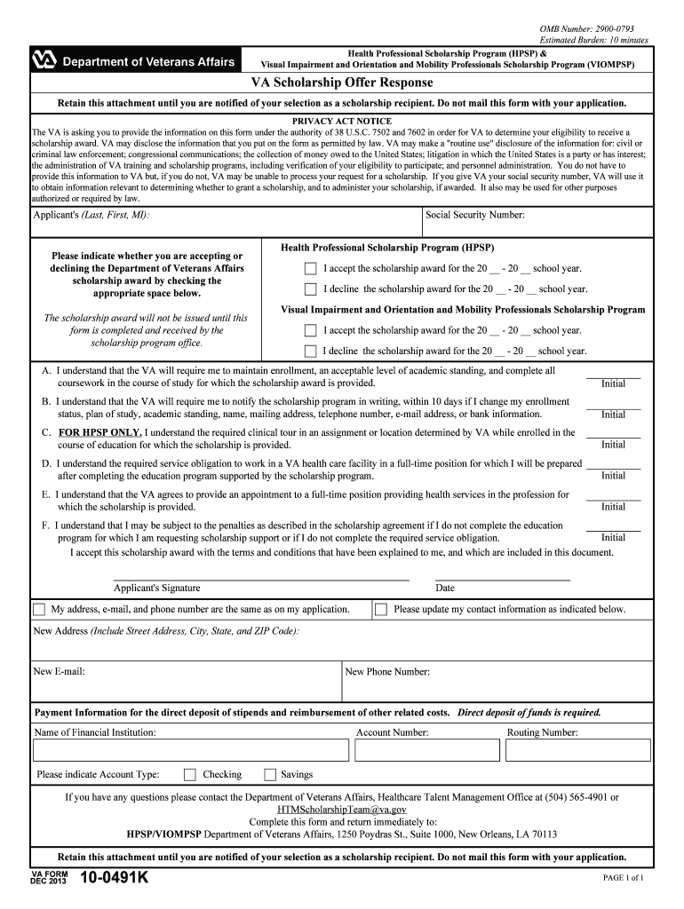 OMB Number: 2900-0793 Estimated Burden: 10 minutes Health Professional Scholarship Program (PSP) & Visual Impairment and Orientation and Mobility Professionals Scholarship Program (BIOMASS) VA Scholarship