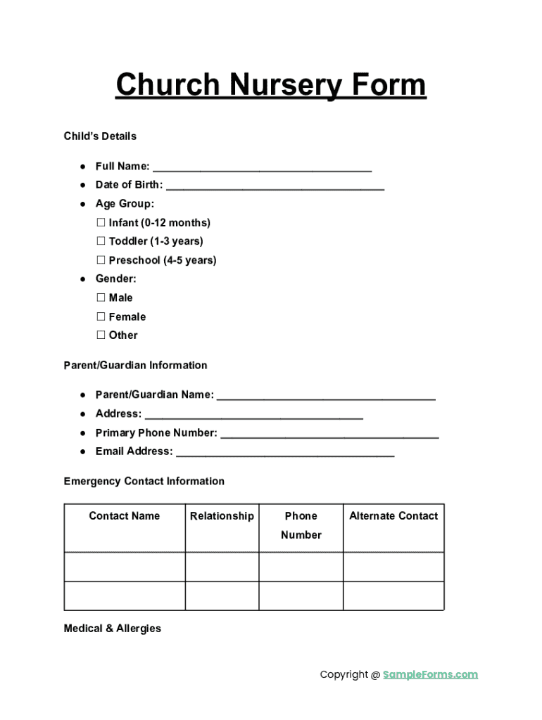 A church nursery form is a document used by churches to collect essential information regarding the care and supervision of children during church-related activities.
