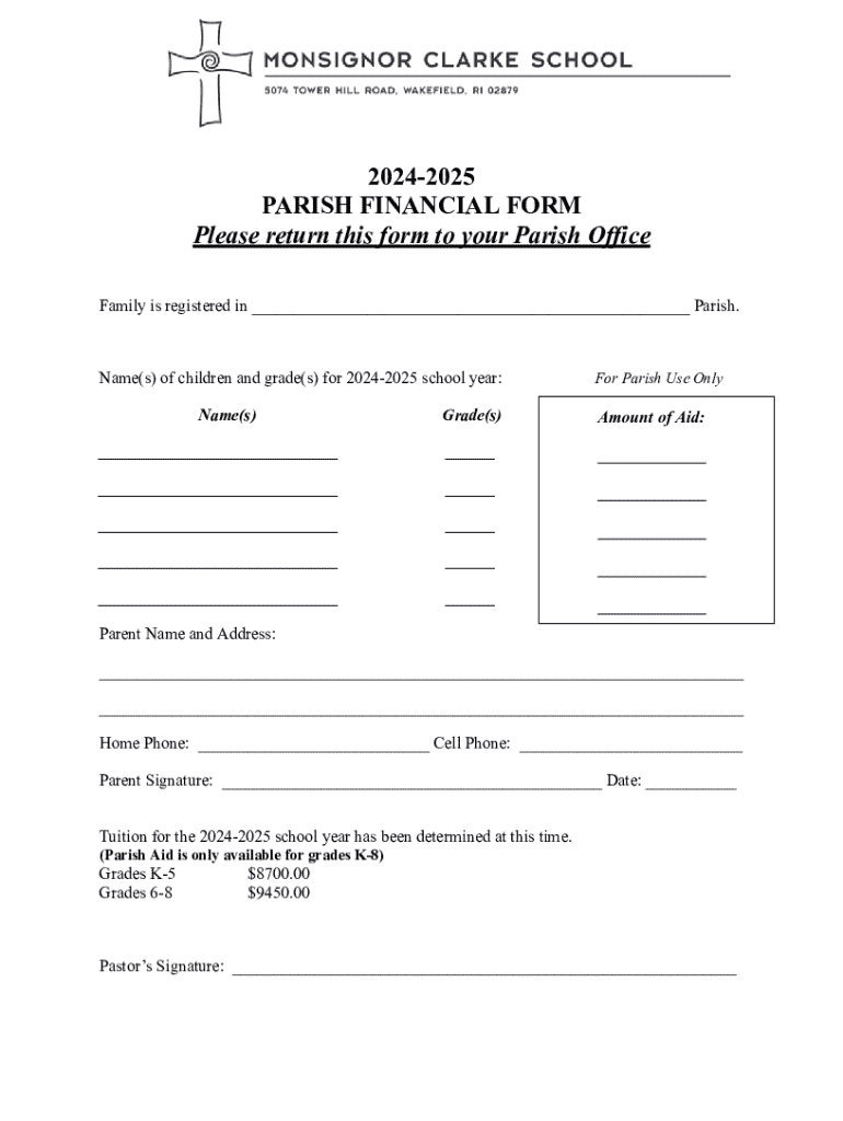 To fill out the parish financial form, gather all relevant financial data, accurately enter the information into the designated sections, double-check for completeness, and submit it according to the instructions provided.
