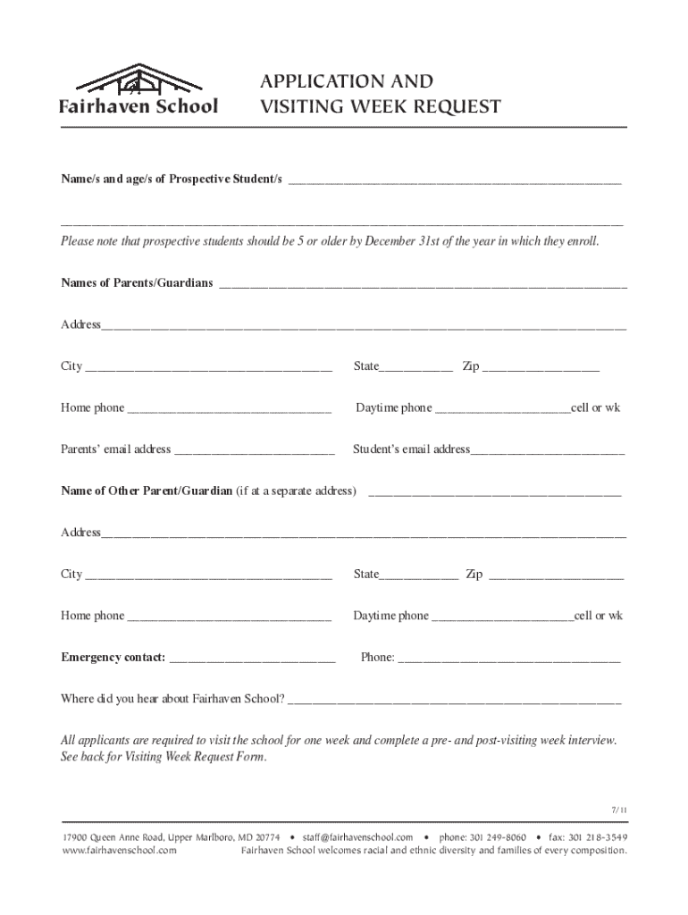FairhavenSchoolAPPLICATIONAND VISITINGWEEKREQUESTName/s and age/s of Prospective Student/s ___ ___ Please note that prospective students should be 5 or older by December 31st of the year in which they enroll.Names of Parents/Guardians ___ Address___ City ___State___ Zip ___Home phone ___Daytime phone ___cell or wkParents email address ___Students email address___Name of Other Parent/Guardian (if at a separate address)___Address___ City ___State___ Zip