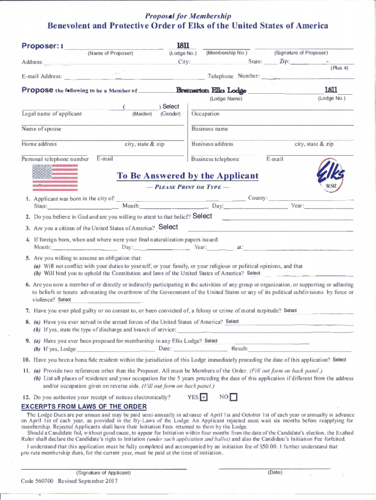 Proposal for MembershipBenevolent and Protective Order of Elks of the United States of America Proposer: I ___1811(Signature of Proposer) Address: __ ___ __ City: __ _ _ _ _ __ State: __ Zip: ___