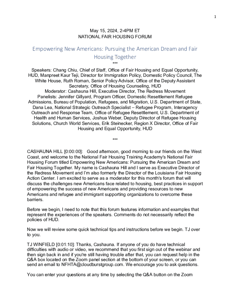 1May 15, 2024, 24PM ET NATIONAL FAIR HOUSING FORUMEmpowering New Americans: Pursuing the American Dream and Fair Housing Together *** Speakers: Chang Chiu, Chief of Staff, Office of Fair Housing and