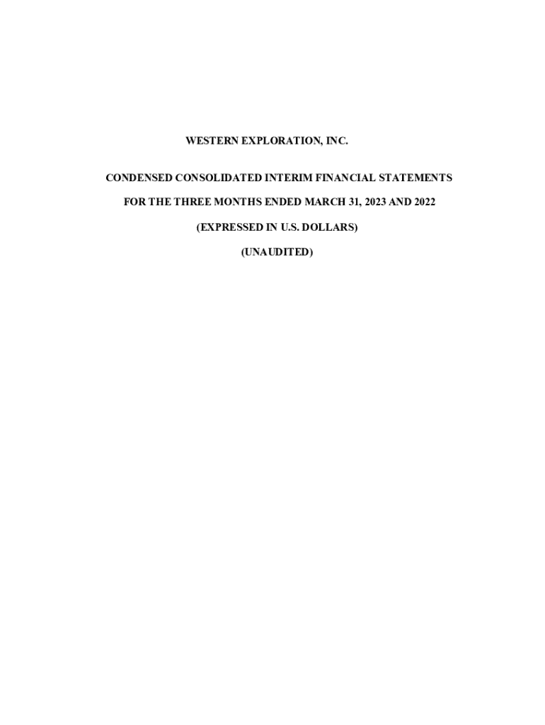 WESTERN EXPLORATION, INC. CONDENSED CONSOLIDATED INTERIM FINANCIAL STATEMENTS FOR THE THREE MONTHS ENDED MARCH 31, 2023 AND 2022 (EXPRESSED IN U.S. DOLLARS) (UNAUDITED)NOTICE TO READER Under National