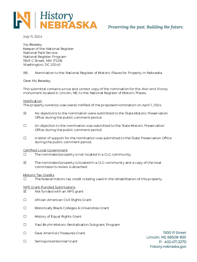 July 11, 2024 Joy Beasley Keeper of the National Register National Park Service National Register Program 1849 C Street, NW (7228) Washington, DC 20240 RE:Nomination to the National Register of Historic