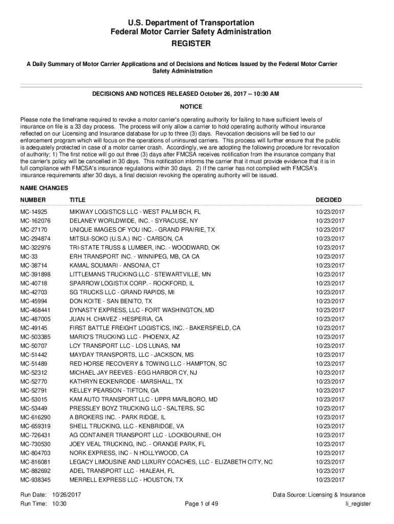 U.S. Department of Transportation Federal Motor Carrier Safety Administration REGISTER A Daily Summary of Motor Carrier Applications and of Decisions and Notices Issued by the Federal Motor Carrier