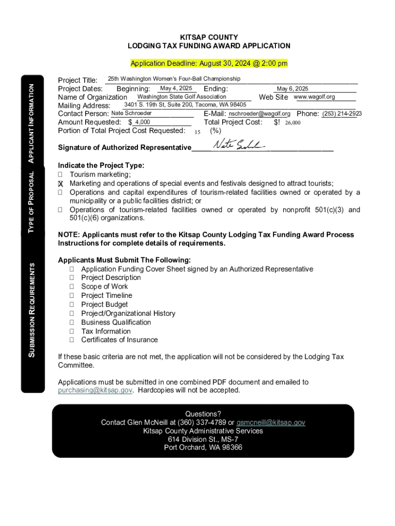 This document is an application form for organizations to request funding from the Kitsap County Lodging Tax Fund. It outlines submission requirements, project details, applicant information, and the process involved in applying for financial support aimed at promoting tourism and related activities in Kitsap County.