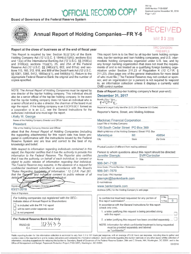 This document is the Annual Report of Holding Companies, submitted in accordance with the law, which outlines the financial performance and structure of Mackinac Financial Corporation as of December 31, 2017. It includes details about the company’s subsidiaries, shareholders owning significant equity, and insights on the management structure.