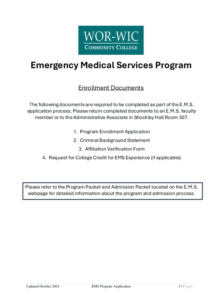 This document outlines the necessary enrollment documents required for the Emergency Medical Services (E.M.S.) program application process at Wor-Wic Community College. It includes the Program Enrollment Application, Criminal Background Statement, Affiliation Verification Form, and Request for College Credit for EMS Experience. Prospective students must return completed documents to an E.M.S. faculty member and ensure compliance with admission criteria.